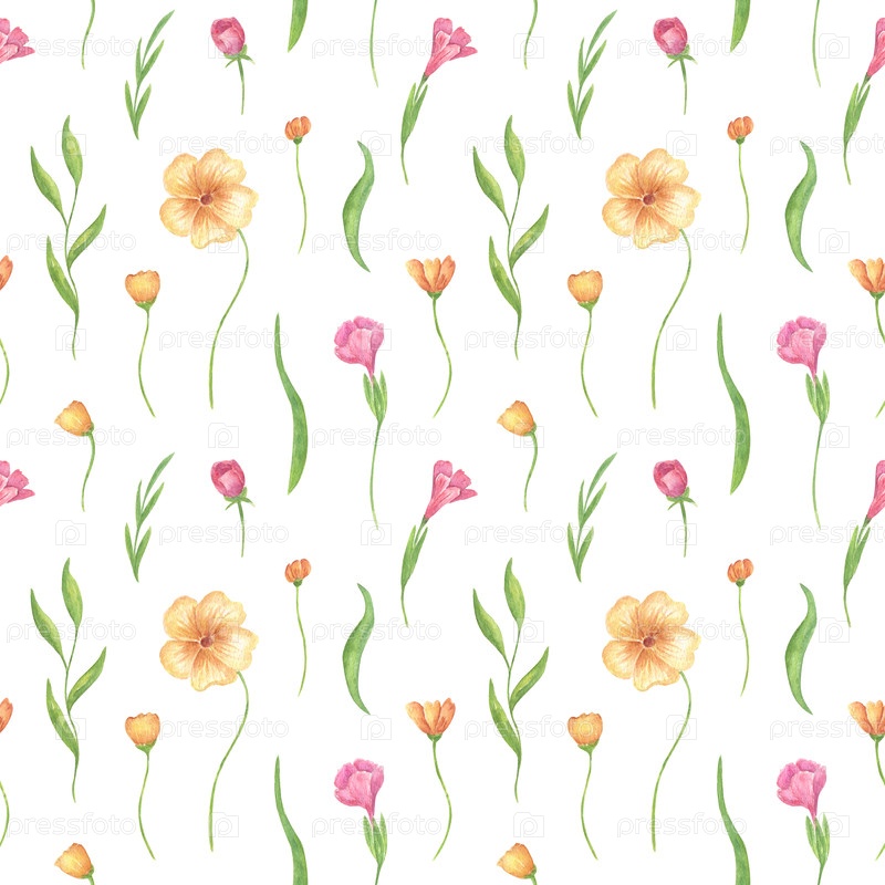 Бесшовный цветочный акварельный узор, розовые и желтые травы