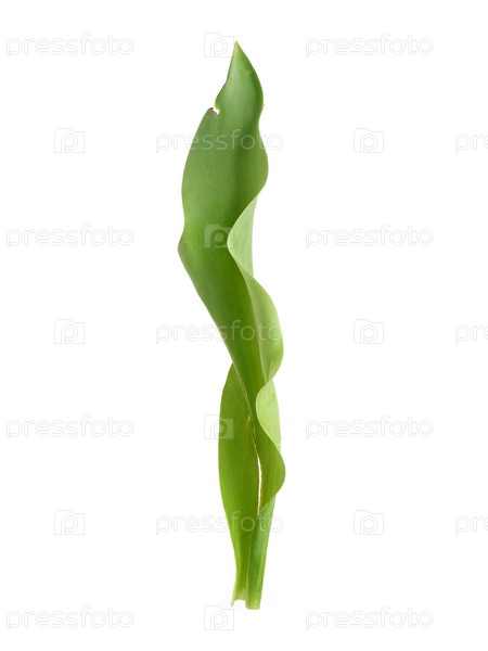 Одиночный зеленый тюльпановый лист, изолированный на простом белом фоне