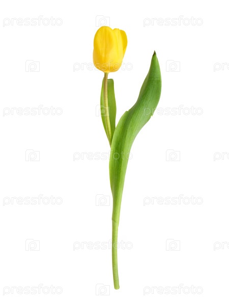 Одиночный, яркий желтый тюльпан с сочными зелеными листьями представлен изолированно на простом белом фоне