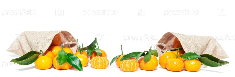 Куча мандаринов с листом на белом фоне