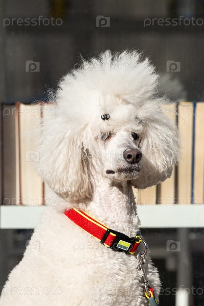 Пушистый белый пудель гуляет на природе