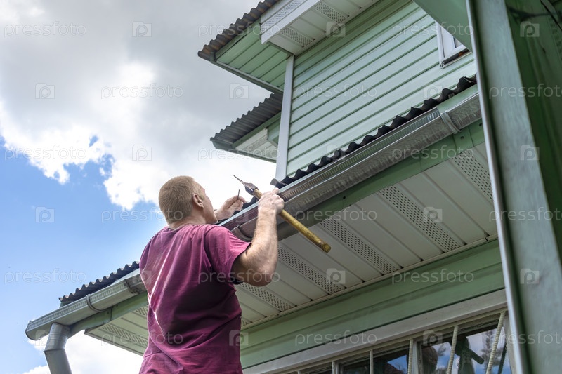 Взрослый мужчина, владелец дачи с гвоздем и топором вместо молотка осматривает крышу для ремонта. Ремонт своими руками. Вид сзади