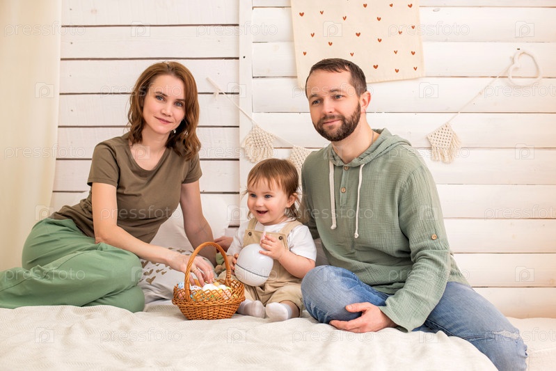 Любящая семья из трех человек сидит на уютной кровати, наслаждаясь Пасхой вместе. Мать, отец и их малыш разделяют радостный момент с плетеной корзиной, полной разноцветных яиц. Теплый и естественный интерьер создает праздничную и домашнюю атмосферу
