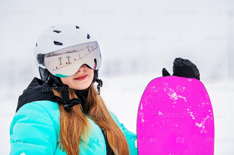 Портрет молодой девушки со сноубордом в горнолыжных очках, на фоне которой отражается подъемник на заснеженном склоне