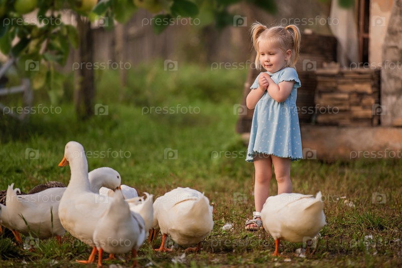 Веселая маленькая девочка в синем платье счастливо играет с утками и гусями на зеленом фермерском лугу во время золотого заката, создавая теплую идиллическую сельскую сцену