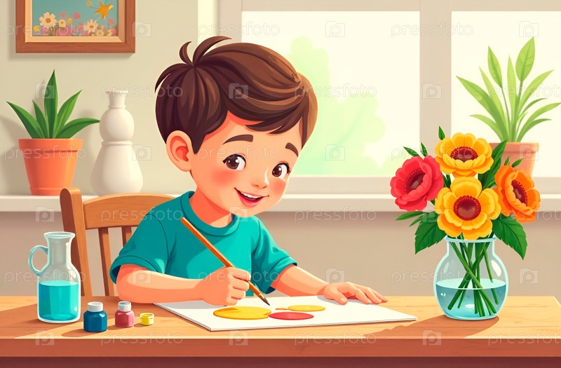 Мальчик рисует дома цветы, стоящие в вазе с натуры. Подарок маме