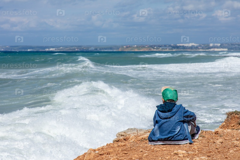 Мальчик в зеленой кепке сидит на берегу моря и мечтает
