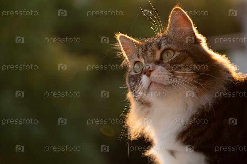 Очаровательный кот с зелеными глазами подсвеченный закатным солнцем смотрит в небо