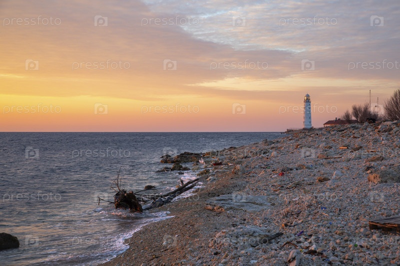 Восхитительный закат на мысе Херсонес. Берег Черного моря хранит следы недавнего шторма а знаменитый Херонесский маяк готовится перенять эстафету у Солнца