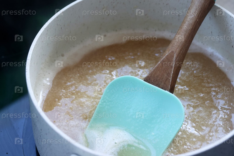 Женщина помешивает кипящий сироп в кастрюле лопаточкой. Она готовит сироп для зефирной смеси. Крупный план
