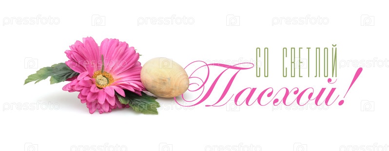 Шаблон пасхального плаката. Ручной работы деревянное яйцо и цветок изолированы на белом фоне. Надпись на русском языке. Элемент дизайна с обтравочным контуром