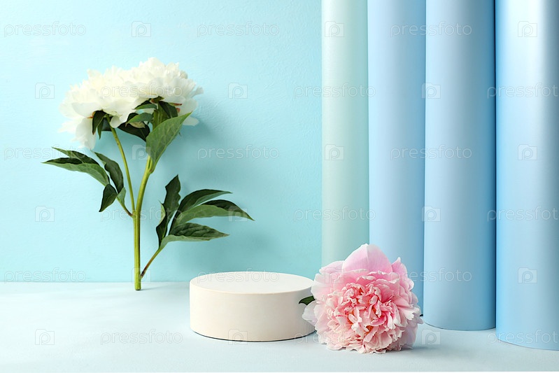 Пустой подиум для продукции и свежие пионы, элегантная концепция красоты, абстрактная красивая цветочная композиция. Сцена для демонстрации продукции и бизнес-концепции. Минимальная современная эстетика. Избирательный фокус