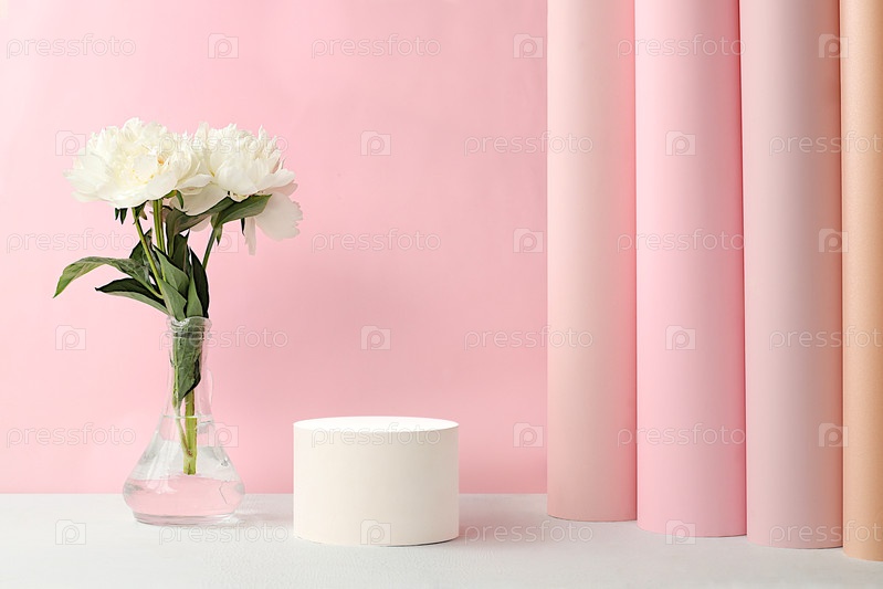 Пустой подиум для продукции и свежие пионы, элегантная концепция красоты, абстрактная красивая цветочная композиция. Сцена для демонстрации продукции и бизнес-концепции. Минимальная современная эстетика. Избирательный фокус