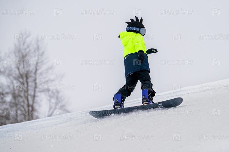 Молодой сноубордист в яркой неоновой куртке спускается по снежному склону. Захватывающие зимние виды спорта и приключения на свежем воздухе