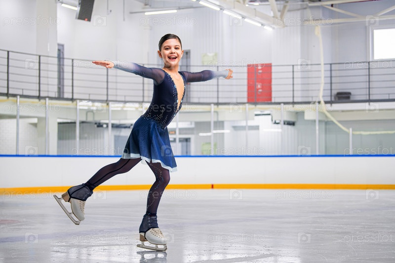 Юная фигуристка катается на льду с улыбкой на лице. Она одета в синее платье-футляр