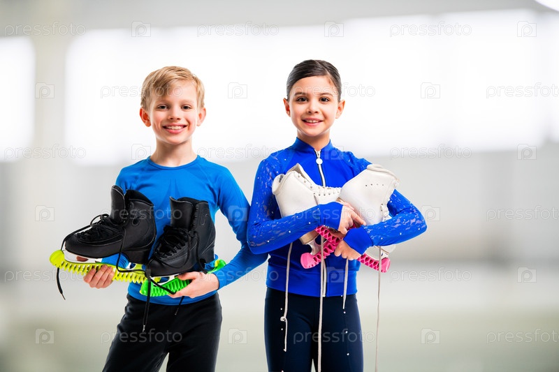Пара юных фигуристов, мальчик и девочка, в ярких костюмах держат коньки в руках и готовятся к тренировке на льду