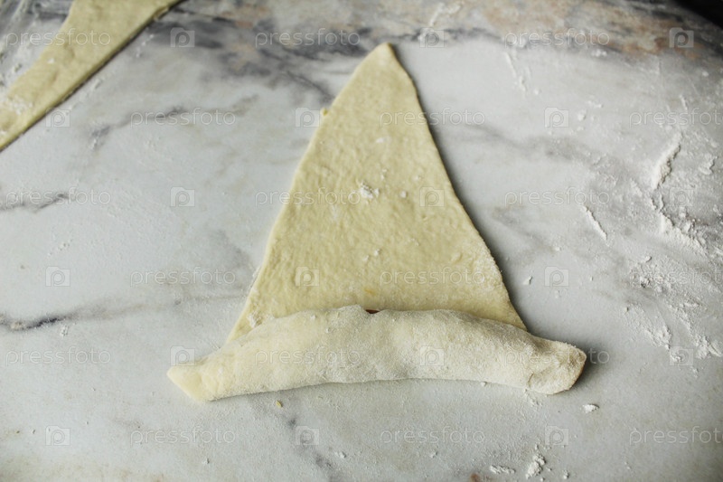 Треугольник из сырого слоеного теста заворачивается в круассан. Приготовление круассанов