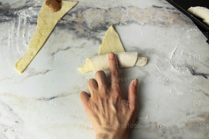 Женская рука скручивает сырое тесто в круассан