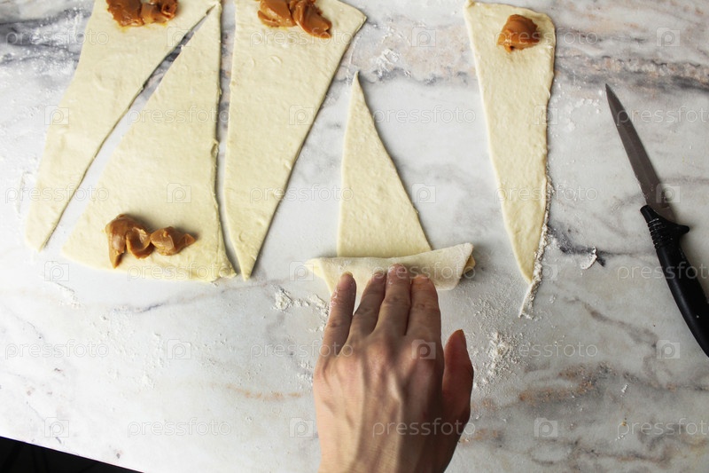 Девочка заворачивает треугольное тесто в круассан, вид сверху