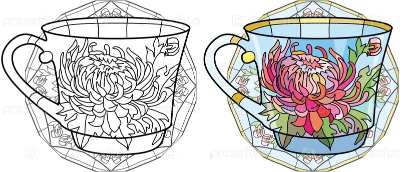 Векторная чашка кофе или чая с хризантемой для раскрашивания. Набор цветов и контуров
