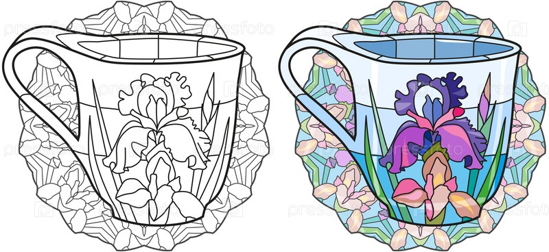 Векторные кофейные или чайные чашки с ирисами для раскрашивания. Набор цветов и контуров
