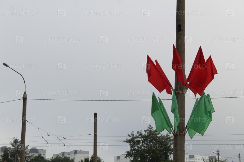 Красные и зеленые флаги на шесте на фоне серого неба