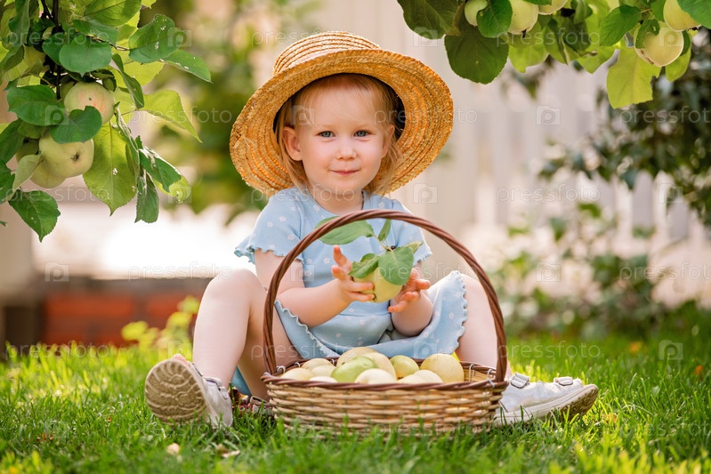 Веселая молодая девушка в соломенной шляпе сидит на траве, держа в руках свежесорванное яблоко. Она наслаждается солнечным днем в саду с корзиной, полной спелых фруктов