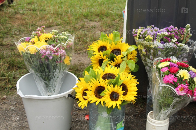 Уличная продажа цветов. Декоративные подсолнухи хризантемы в ведре