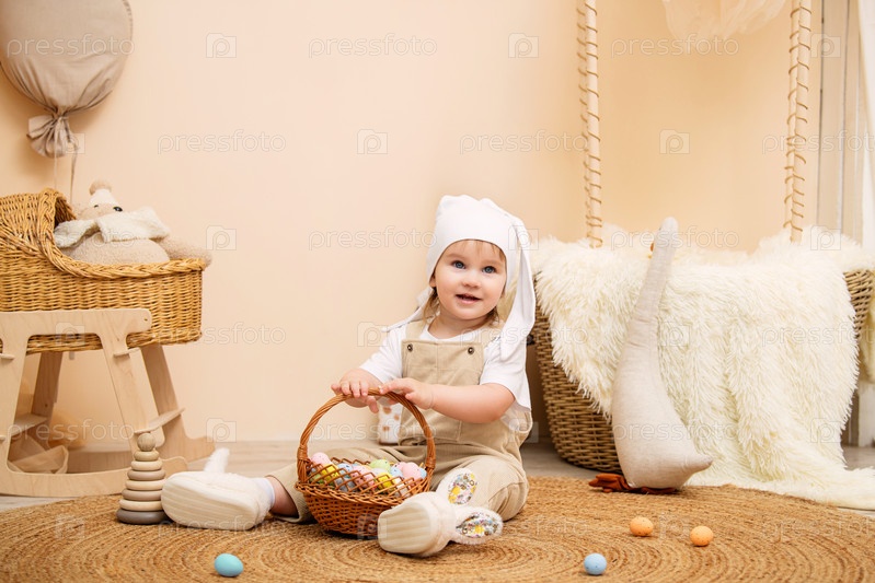Веселый малыш в белой шапочке с ушками зайчика и бежевом комбинезоне сидит на мягком коврике, держа в руках плетеную корзину, наполненную разноцветными пасхальными яйцами. Теплая и уютная детская комната с натуральными деревянными и плетеными элементами