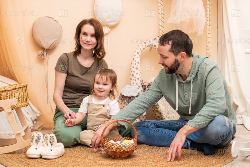 Мать, отец и их маленький ребенок сидят вместе на полу в уютной, красиво украшенной детской. Малыш улыбается, держась за руки с матерью, а отец тянется к плетеной корзине, наполненной красочными пасхальными яйцами
