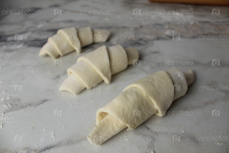Три сырых круассана лежат на столе, вид сбоку Домашняя выпечка