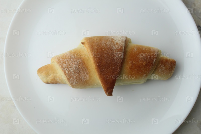 Запеченный поджаренный круассан с щетинистой поверхностью на белой тарелке, вид сверху крупным планом
