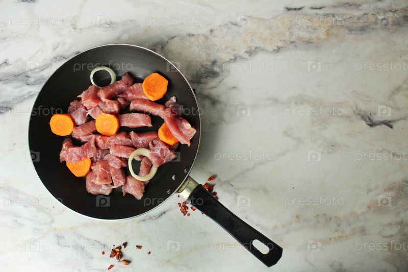 Кусочки сырой свинины и овощей, лук, морковь на сковороде, вид сверху copyspace