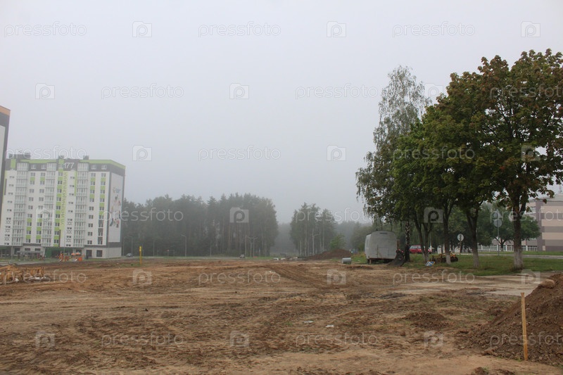 Туман ранним летним утром между деревьями и домами. Туман в городском парке