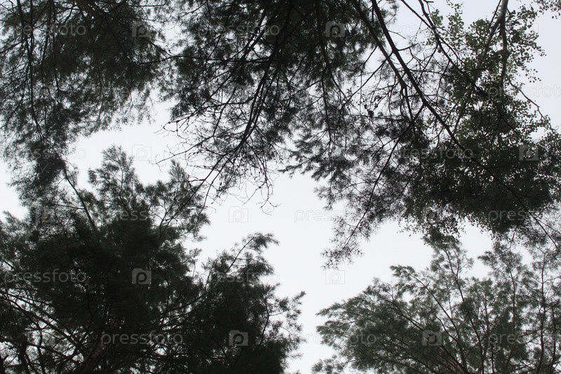 Промежуток между ветвями деревьев в лесу, парке, вид снизу. Парадокс застенчивости деревьев