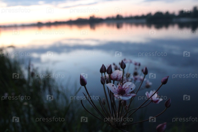 Болотные нежные розовые цветы на фоне заката на реке. Водная растительность