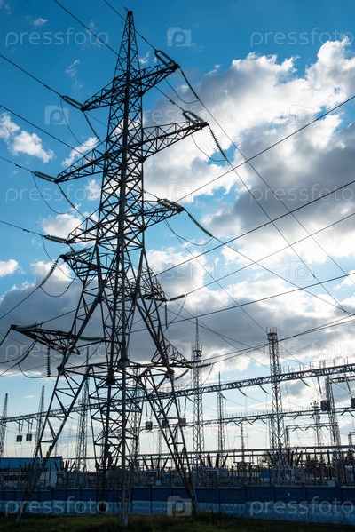 Крупная электроподстанция с возвышающимися линиями электропередачи и металлическими конструкциями, поставляющая электроэнергию под частично облачным небом