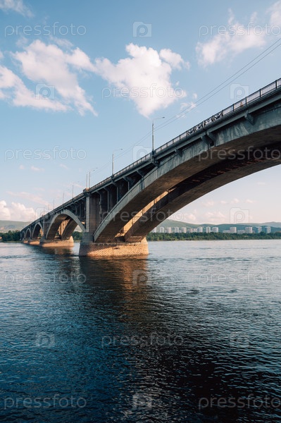 Коммунальный мост через реку Енисей в прекрасный солнечный летний день в Красноярске