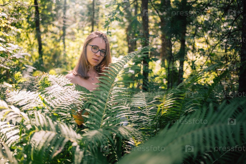 Женщина среди лесных папоротников в солнечном свете