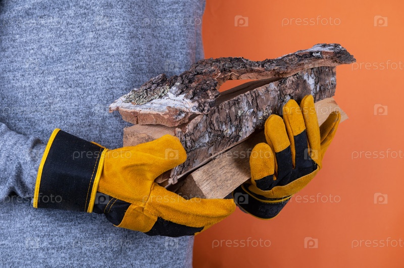 Человек в желтых рабочих перчатках держит дрова на оранжевом фоне, подчеркивая безопасность и работу на открытом воздухе