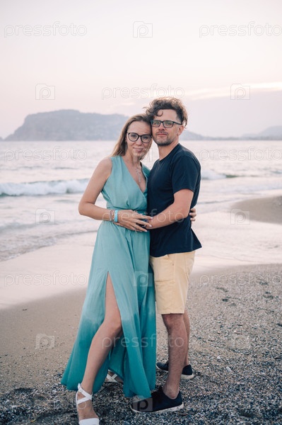 Улыбающаяся пара разделяет радостный момент на пляже на закате, мужчина и женщина возле морских волн, Аланья, Турция