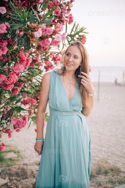 Изящная женщина в бирюзовом платье позирует возле цветущих розовых цветов, наслаждаясь умиротворяющим моментом на лоне природы
