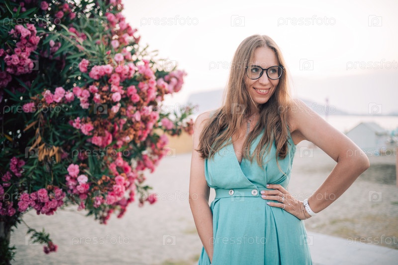 Изящная женщина в бирюзовом платье позирует возле цветущих розовых цветов, наслаждаясь моментом покоя на лоне природы