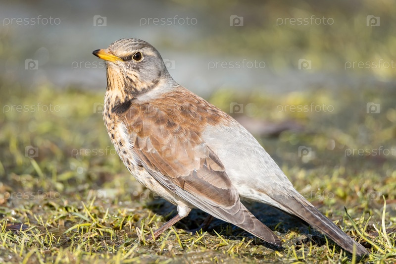 Снежная птица на зеленой весенней траве (Turdus pilaris)