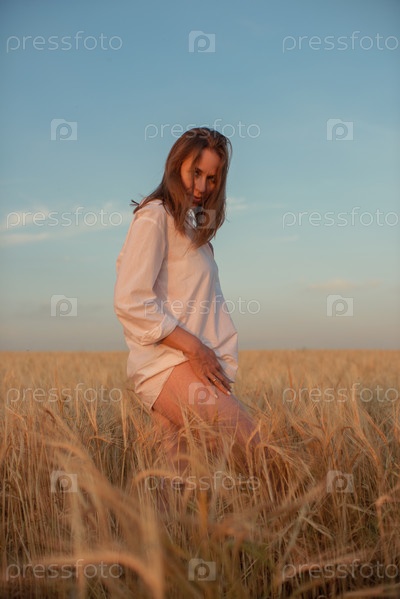 Молодая женщина в белой рубашке стоит на золотистом пшеничном поле во время заката, залитая теплым светом