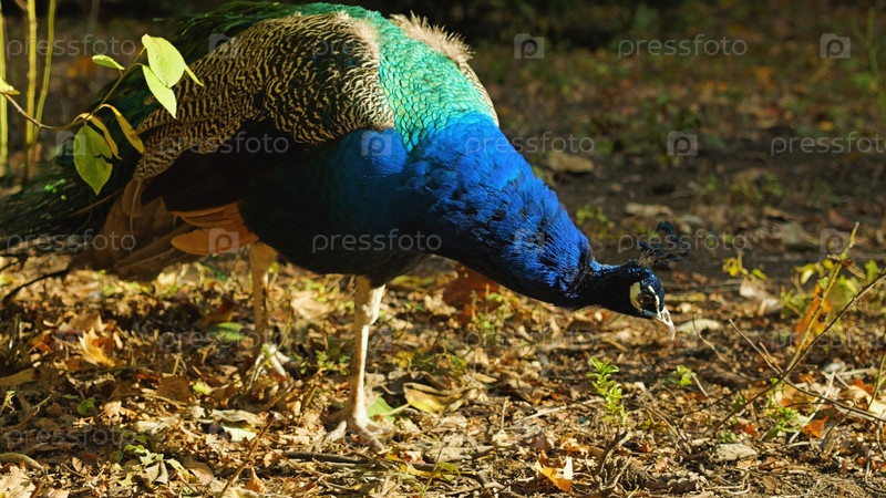 Павлин ищет еду в лесу. Крупный план самца павлина с ярким синим, зеленым и коричневым оперением. Птица ходит по подстилке из листьев в лесу, высматривая еду