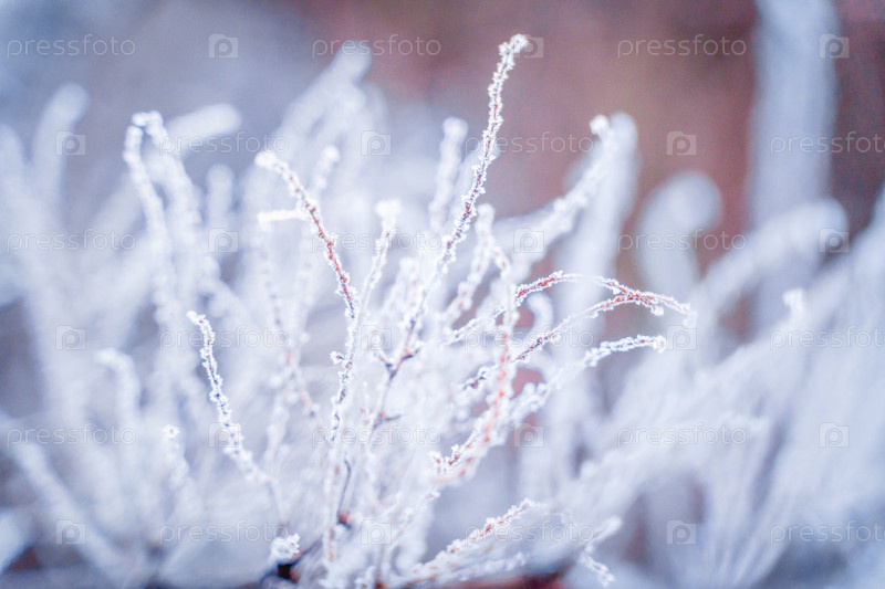 Ветви деревьев, покрытые инеем в морозный зимний день, крупный план