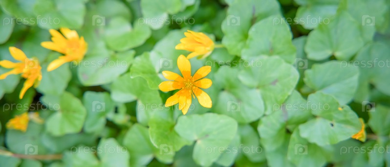 Желтый цветок среди зелени размытый фон