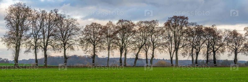 Ряд деревьев на поле под грозовым небом