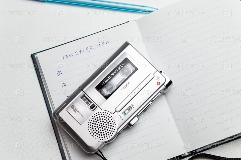 Магнитофон с кнопками находится на блокноте с надписью «Расследование». Белый фон и рабочее пространство студента-детектива-профессора